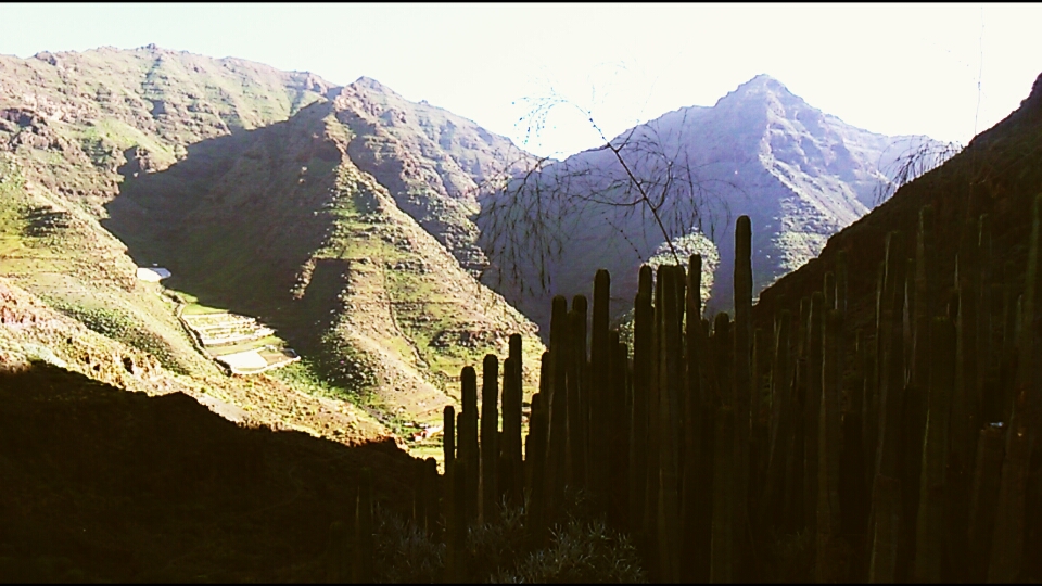 Nous arrachant d’une interminable route en épingle, notre couple-miracle se fréquente et plus encore au quotidien depuis 44 ans. Nos sacs atterrissent dans la remorque pleine d’herbe fraîchement coupée. Pour nous faire plaisir, sans qu’on leur demande rien, ils nous font passer par le barranco de los Cernicales, gros repère de canyoneurs en quête d’adrénaline. Nous traversons ensuite el Valle de los Nueves (parce qu’au départ, il n’y avait là que 9 maisons pour la petite histoire…)